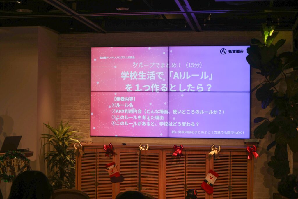 続くグループワークでは、「学校生活でAIルールを1つ作るとしたら?」をテーマに、紙にアイデアを書き出しながら議論を深めていきました。