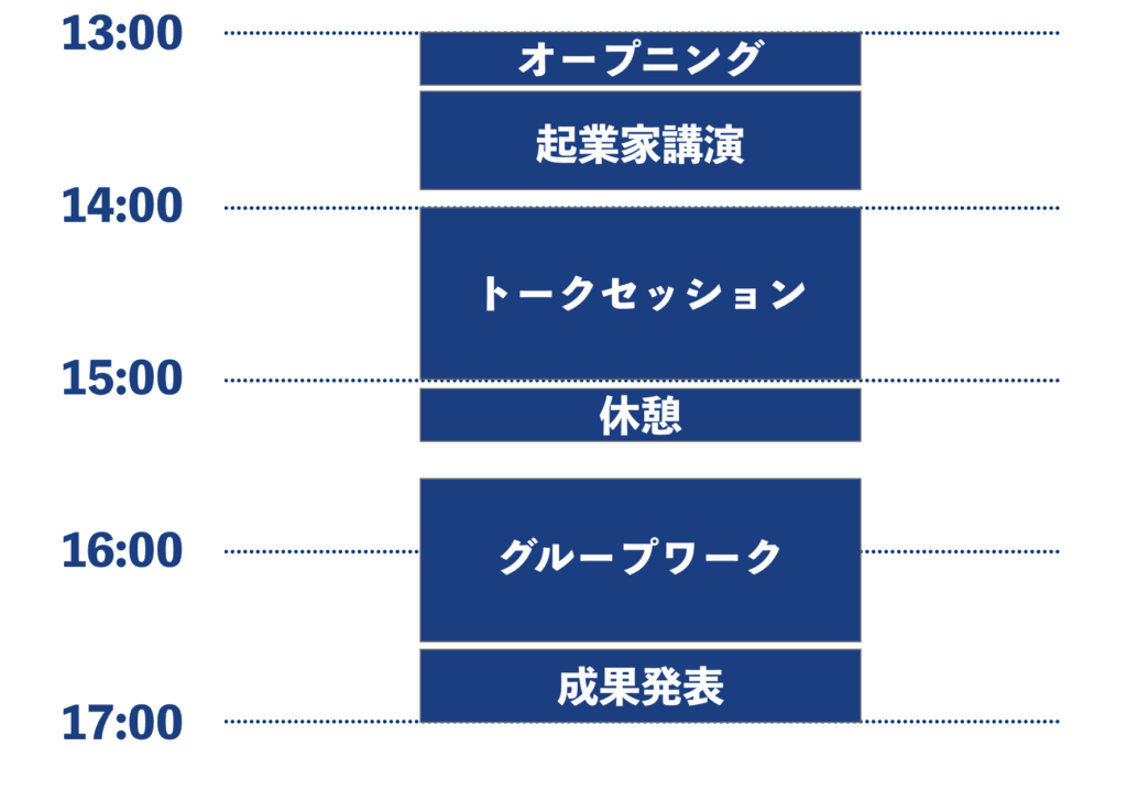 本プログラムでは、コミュニティデザイナーの相内洋輔さんの司会進行のもと、起業家による講演・トークセッション・グループワークを通じて、参加者が起業や課題解決に関する理解を深める機会を提供しました。